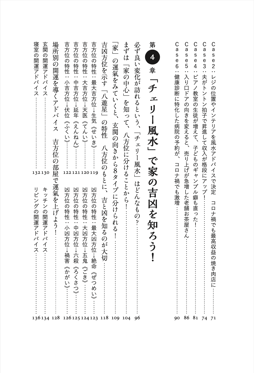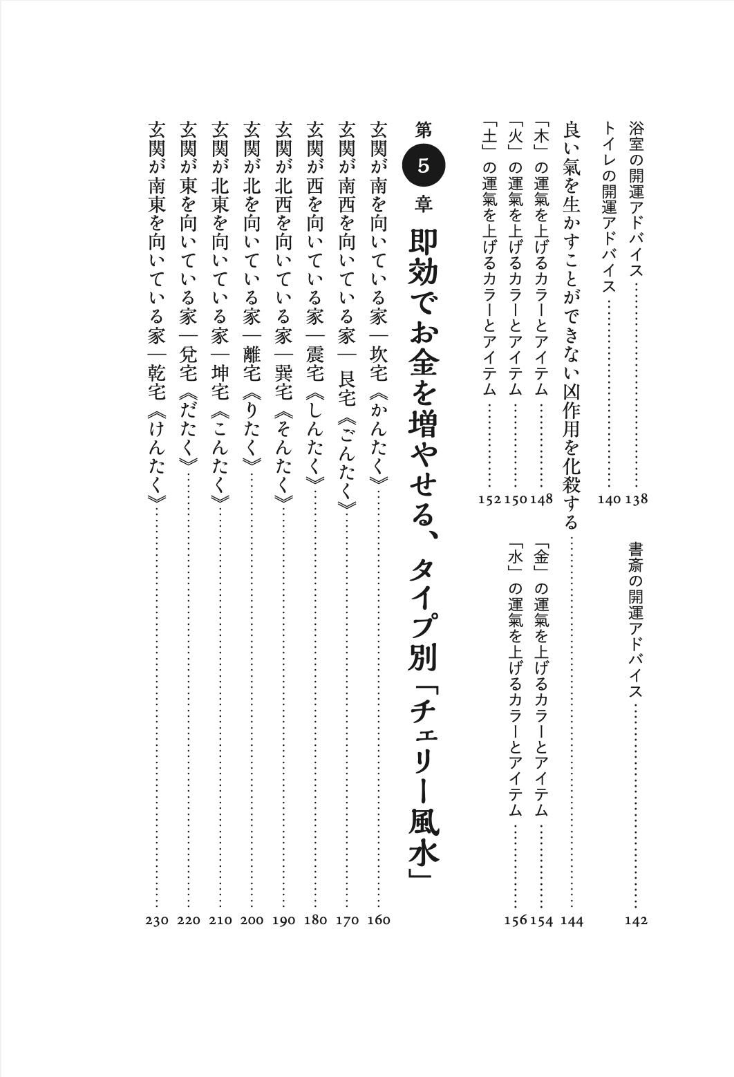 中国伝統風水をもとにした「チェリー風水」で、運氣を上げ、金運と幸運を呼び込む方法を指南する。
